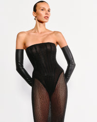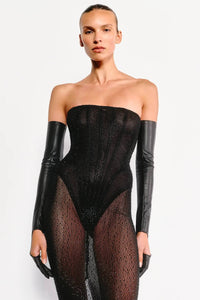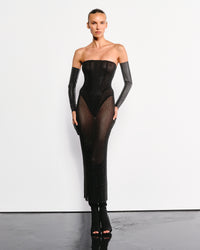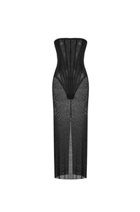 Ця сукня — ода жіночій бездоганності. В основі сукні — інкрустований структурований боді-корсет, прикрашений мерехтливими кристалами, який підкреслює талію та створює бездоганний силует. Силуетна спідниця міді додає витонченості та розкоші, поєднуючи загадкову півпрозорість із мерехтінням каміння. Ця сукня стане ідеальним вибором для особливих подій, урочистих заходів або важливих моментів, коли хочеться виглядати бездоганно.