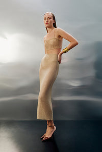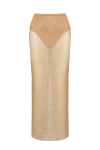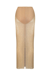 Міні-спідниця м’яко облягає тіло, створюючи подовжений силует, який підкреслює чистоту ліній і сучасну елегантність. Сяйво кристалів переливається при кожному кроці, додаючи образу витонченої сміливості та благородного блиску напівпрозорого матеріалу, а вшита білизна забезпечує зручність і ідеальну посадку.