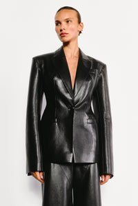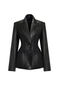 Жакет — втілення елегантності та сміливості. Чіткі лінії крою та структуровані плечі формують бездоганний силует пісочного годинника, підкреслюючи вашу фігуру. Акцентні лацкани додають витонченості, а подовжені рукава із відкритими шліцами – створюють легкість і вільність руху. Виготовлений із м’якої чорної веганської шкіри, він поєднує сучасну розкіш із класичною досконалістю. Ідеальний як для створення вишуканого образу з широкими штанами або міді-спідницею, так і для вечірнього виходу.