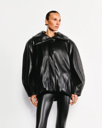 Bold and effortlessly cool, the Vegan Leather Iconic Bomber is a statement piece that combines edgy style with everyday functionality. Crafted from buttery-soft vegan leather, it features a relaxed, oversized silhouette that exudes modern confidence. Designed with exaggerated proportions, a high collar, and sleek detailing, this bomber is perfect for layering over slim-fit jumpsuits, dresses, or tailored pants. Whether you’re dressing for day or night, this jacket offers a contemporary take on classic outerwear, delivering both comfort and high impact style.