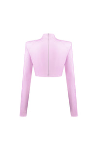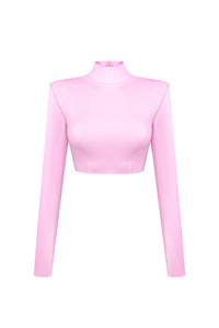 Рожевий укорочений топ з довгими рукавами та високою горловиною втілює сучасну елегантність і усвідомлений підхід до дизайну. Виготовлений із 4D-стрейч веганської шкіри, матеріал точно адаптується до рухів тіла, формуючи чіткий і витончений силует.